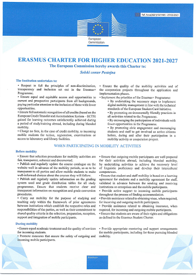 Višja strokovna šola Postojna je dobitnica ECHE listine – Certifikata za program ERASMUS+, za programsko obdobje 2021_2027.
